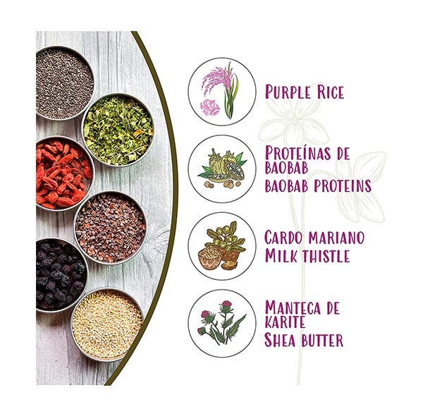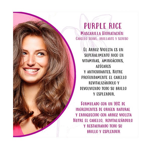- Arroz Violeta: debe su color a su alto contenido en antocianinas con poderes antioxidantes y vigorizantes. Rico en elementos esenciales, el arroz tiene todo lo que el cabello y cuero cabelludo necesita: aminoácidos y azúcares para nutrir en profundidad. Su alto contenido en vitaminas revitaliza y devuelve el brillo al cabello.