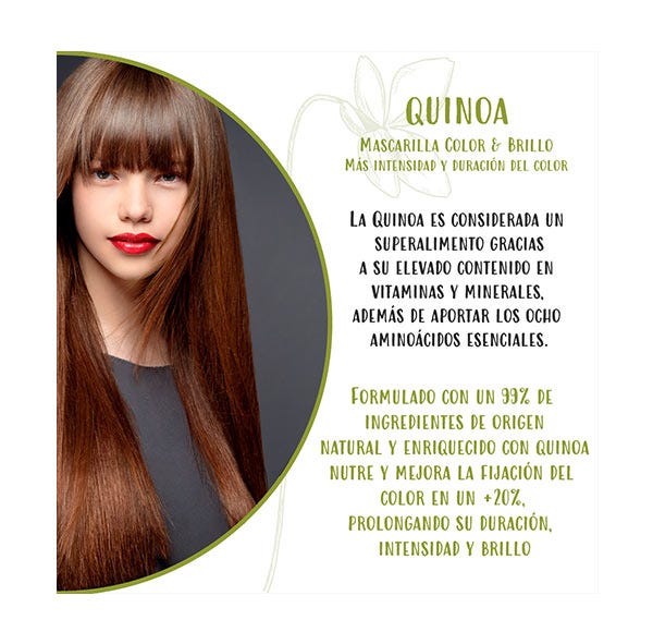 - Quinoa: la quinoa es una proteína completa, que contiene los ocho aminoácidos esenciales para el cabello. Fija el color +20%, con resultado tonos más intensos y de mayor duración. Color, brillo y esplendor en un cabello de aspecto saludable.