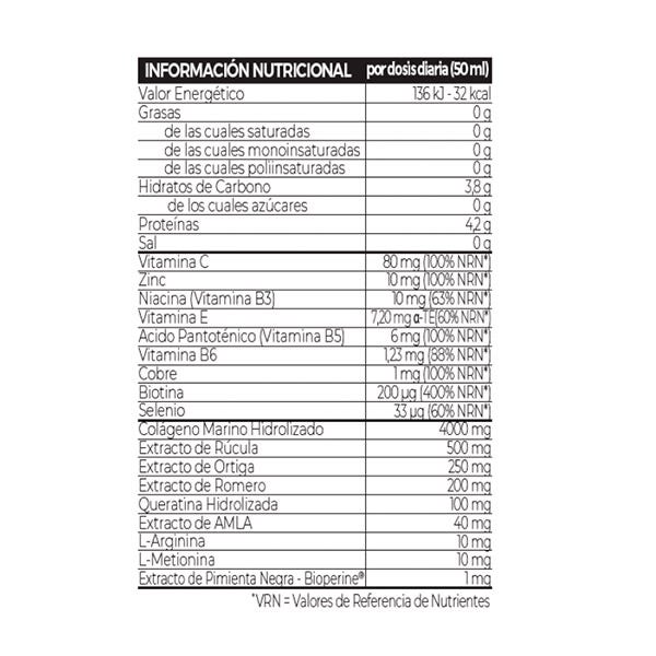 INGREDIENTS: Agua, Colágeno Hidrolizado (pescado), Potenciador del Sabor: Eritritol; Extracto de Rúcula (Eruca sativa Mill.) hierba, Corrector de Acidez: Ácido Cítrico, Extracto de Hoja de Ortiga (Urtica dioica L.), Extracto de Hoja de Romero (Rosmarinus officinalis L.), Aromas, Ácido L-Ascórbico (Vitamina C), D--tocoferol (Vitamina E) (emulgente: lecitina de soja), Queratina Hidrolizada, Gluconato de Zinc, -ciclodextrina, Extracto de Fruta de Grosella Espinosa India (AMLA) (Phyllanthus emblica L.), Levadura Enriquecida con Selenio, Jugo de Piña Concentrado, Edulcorante: Glucósidos de Esteviol; D-Biotina (Biotina), L-Arginina, L-Metionina, Nicotinamida (Niacina-Vitamina B3), Gluconato de Cobre, D-pantotenato Cálcico (Ácido Pantoténico - Vitamina B5), Clorhidrato de Piridoxina (Vitamina B6) y Extracto de Pimienta Negra (Piper nigrum L.) fruta (Bioperine®).
