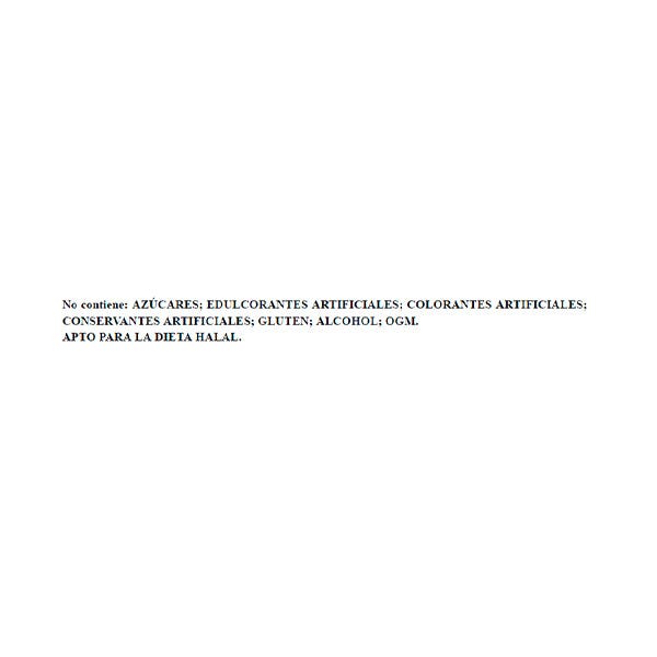 No contiene: AZÚCARES; EDULCORANTES ARTIFICIALES; COLORANTES ARTIFICIALES; CONSERVANTES ARTIFICIALES; GLUTEN; ALCOHOL; OGM. APTO PARA LA DIETA HALAL.