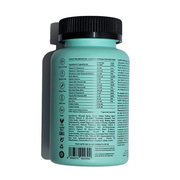 HAPPY HAIR es el nutricosmético con la concentración de activos más potente del mercado. La formulación de este complemento vitamínico de 15 activos clínicos 100% naturales y veganos está científicamente diseñada para aportar lo que tu cabello necesita para recuperar su fuerza.