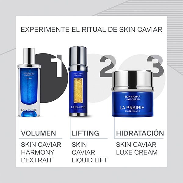 • El presérum facial Skin Caviar Harmony L’Extrait de La Prairie repara y refuerza los pilares verticales de la piel, proporcionando un efecto reafirmante y rejuvenecedor