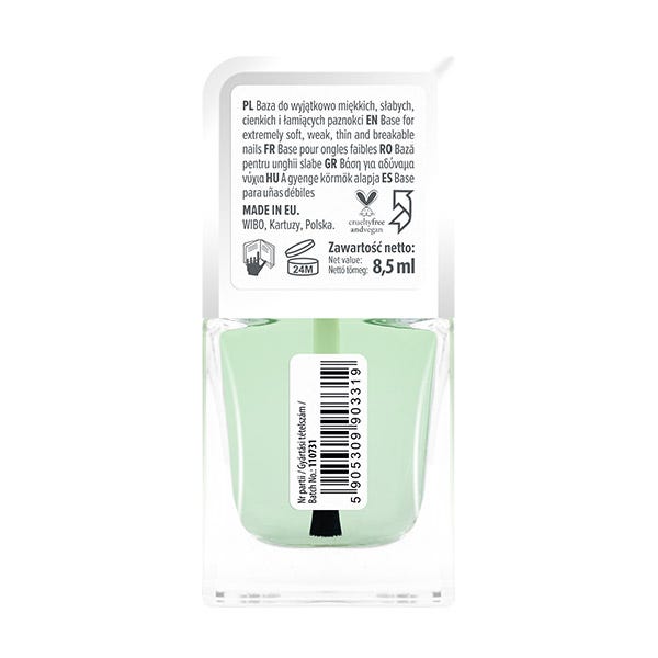 Contiene ácidos AHA, PHA, vitamina E, escualeno y extracto de bambú que fortalecen y nutren las uñas.