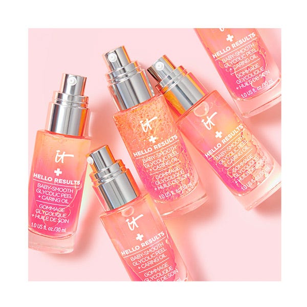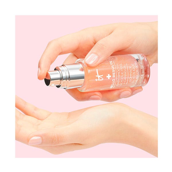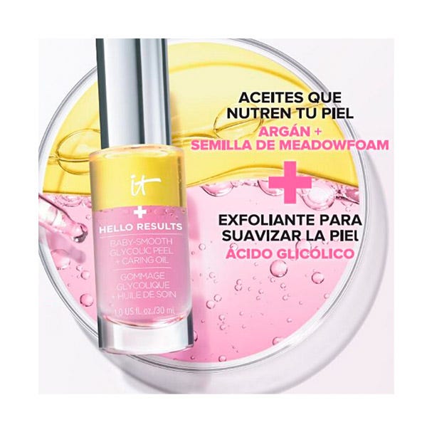 ¿QUÉ ES? IT COSMETICS Hello Results Baby-Smooth Glycolic Peel + Caring Oil Peeling es un exfoliante de ácido glicólico diario de uso nocturno.