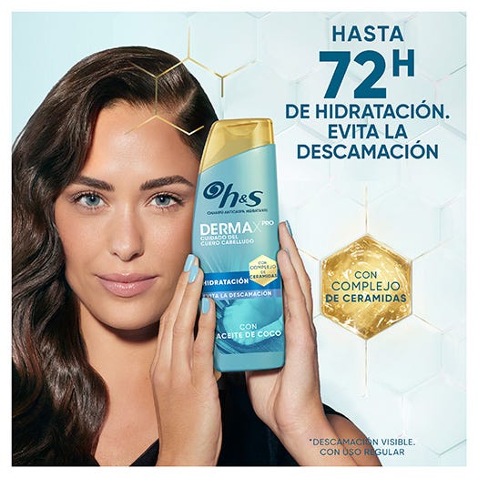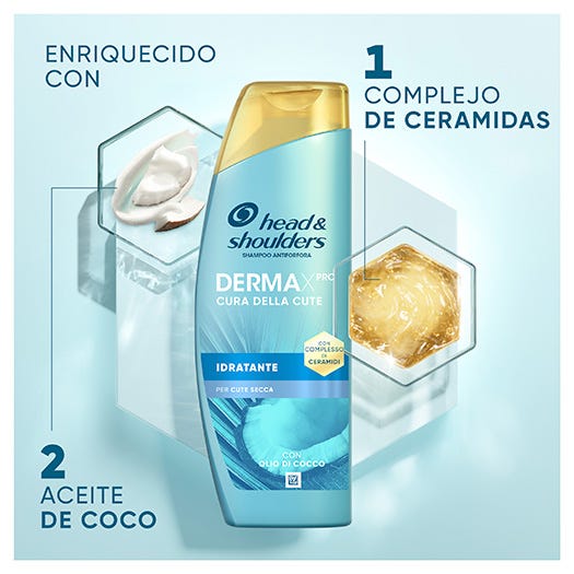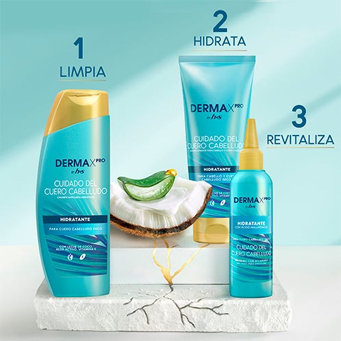 ¿Sabías que el cuero cabelludo seco necesita algo más que hidratación? El champú anticaspa DERMAXPRO de H&S ayuda a reforzar la barrera natural de la piel y restablece el equilibrio natural del cuero cabelludo. Nuestra fórmula está enriquecida con ingredientes para el cuidado de la piel, como aloe activo, leche de coco y vitamina E, y potenciada por un ingrediente activo clínicamente probado: la piroctona olamina. ¿El resultado? Un cuero cabelludo hidratado y sin caspa*. * Caspa visible, con un uso regular.