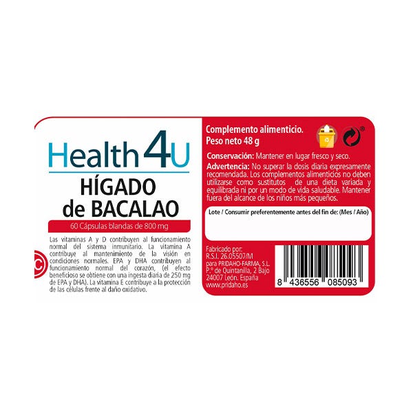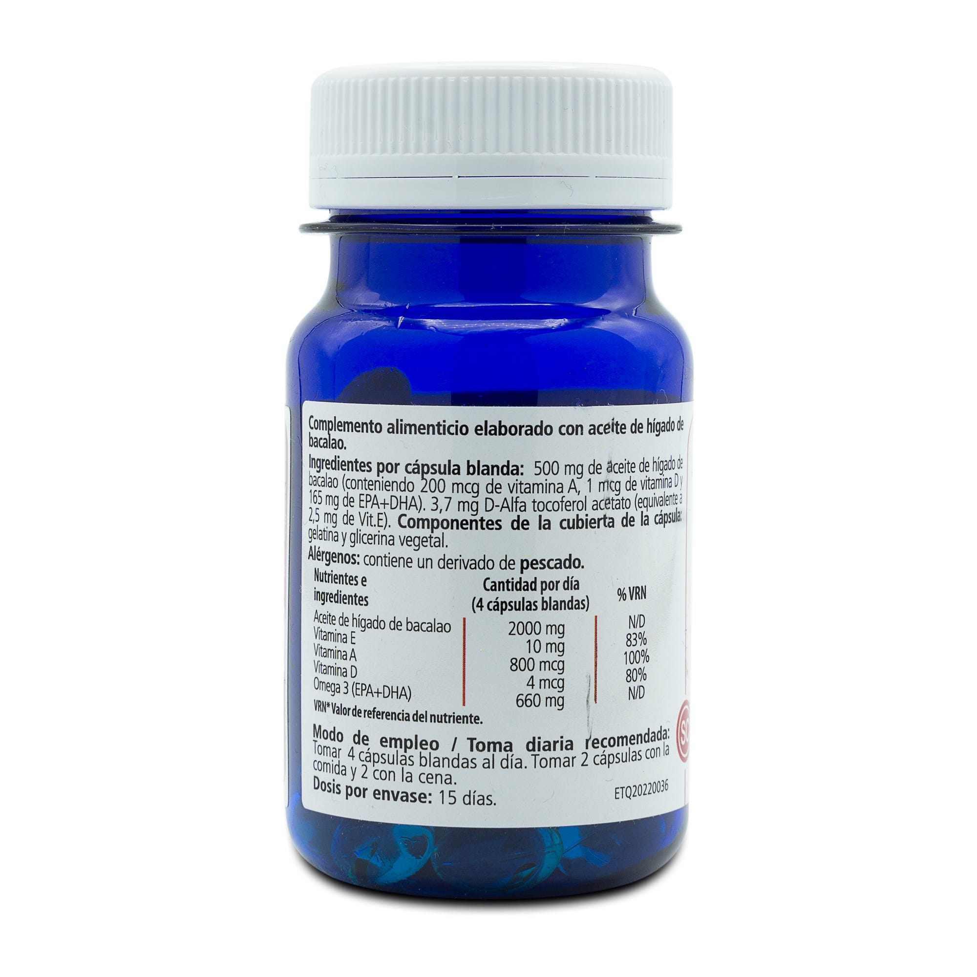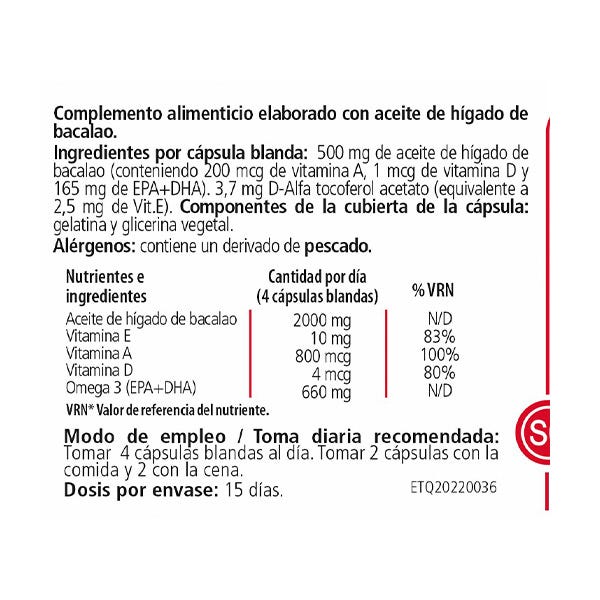 Ingredientes por cápsula blanda: 500 mg de aceite de hí­gado de bacalao (conteniendo 200 mcg de vitamina A, 1 mcg de vitamina D y 165 mg de EPA+DHA). 3,7 mg D-alfa todoferol acetato (equivalente a 2.5 mg de Vit. E). Cubierta de la capsula: gelatina y glicerina vegetal.