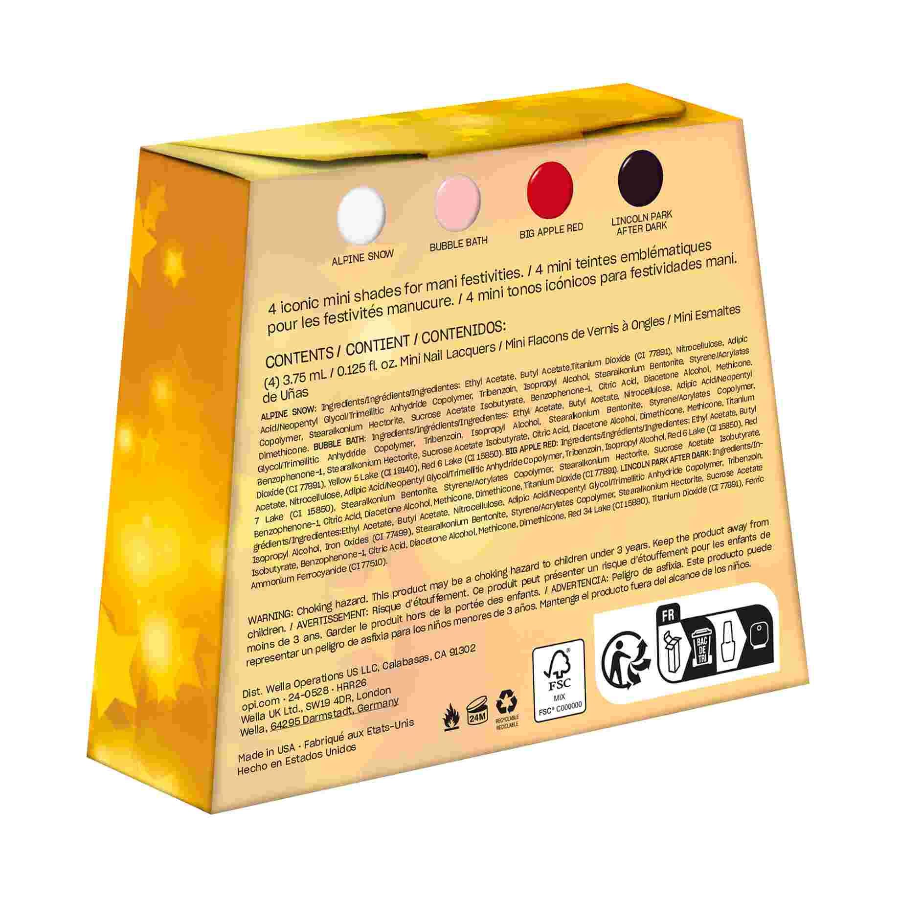 4 mini Nail Lacquer (1 por tono): Bubble Bath, Alpine Snow, Big Apple Red, Lincoln Park after Dark.
