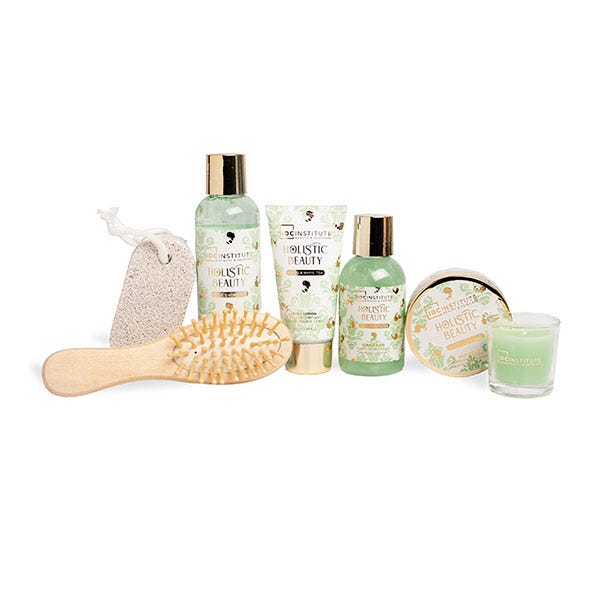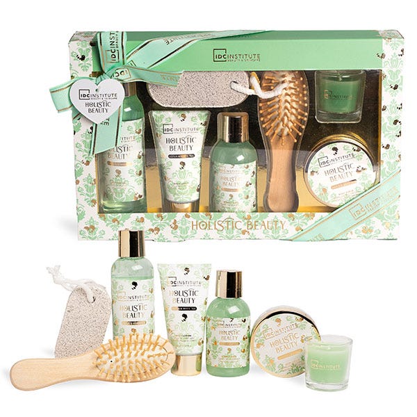 Eleva tu rutina de cuidado personal con el Set de Regalo de 7 piezas de Holistic Beauty de IDC Institute. Esta exquisita colección incluye un lujoso gel de ducha, un indulgente baño de burbujas, una nutritiva loción corporal, un vigorizante exfoliante corporal, una vela perfumada, una suave piedra pómez y un conveniente cepillo para el cabello.