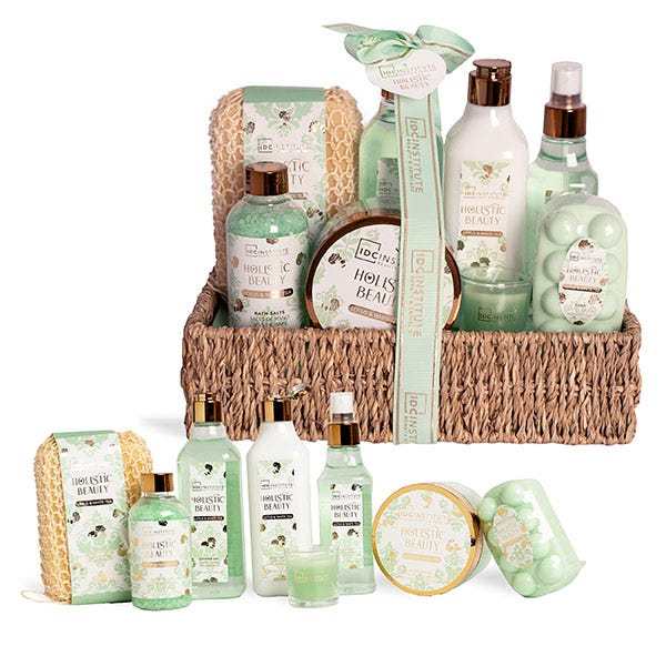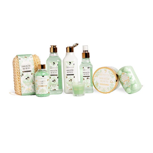 Nuestro conjunto Holistic te sumerge en un mundo de bienestar. Este set incluye una esponja Sisal exfoliante, gel de baño revitalizante, crema de manos y cuerpo de alta calidad, y una bruma corporal refrescante.