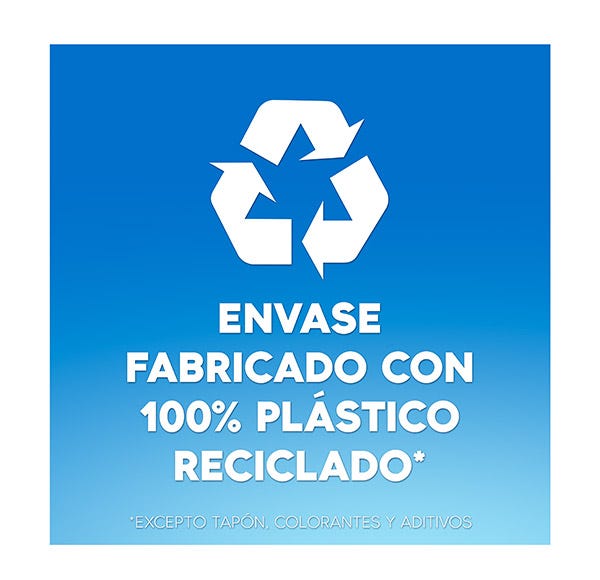 La botella está hecha con un 100 % de plástico reciclado y es reciclable.