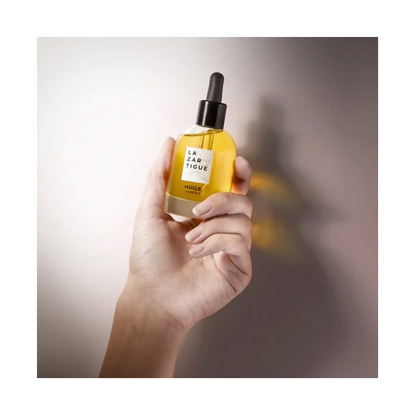 Huile Des Reves es un aceite seco nutritivo de origen natural sin silicona que nutre la fibra, sublima el cabello y aporta un brillo intenso, sin acabado graso.