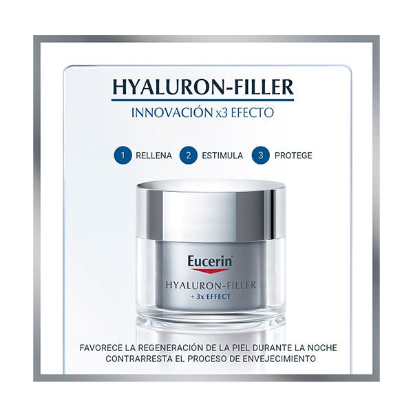 La crema facial Hyaluron-Filler Noche de Eucerin, ideal para piel madura, piel mixta, piel seca y piel normal, contrarresta el proceso del envejecimiento gracias a su fórmula de triple efecto: