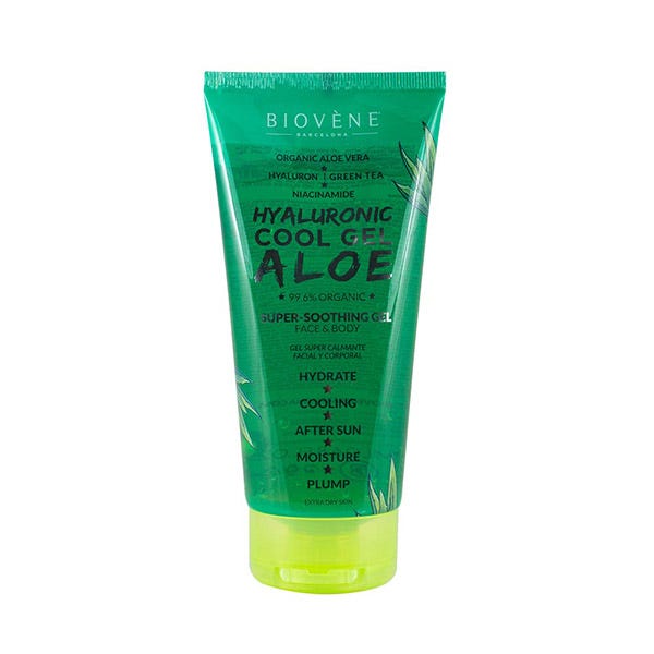 Gel súper calmante para rostro y cuerpo elaborado con un 99.6% de aloe vera orgánica y ácido hialurónico hidratante que refresca, rellena e hidrata instantáneamente la piel seca.