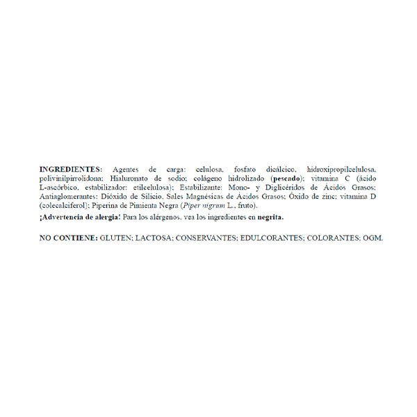 INGREDIENTES: Agentes de carga: celulosa, fosfato dicálcico, hidroxipropilcelulosa, polivinilpirrolidona; Hialuronato de sodio; colágeno hidrolizado (pescado); vitamina C (ácido L-ascórbico, estabilizador: etilcelulosa); Estabilizante: Mono- y Diglicéridos de Ácidos Grasos; Antiaglomerantes: Dióxido de Silicio, Sales Magnésicas de Ácidos Grasos; Óxido de zinc; vitamina D (colecalciferol); Piperina de Pimienta Negra (Piper nigrum L., fruto).