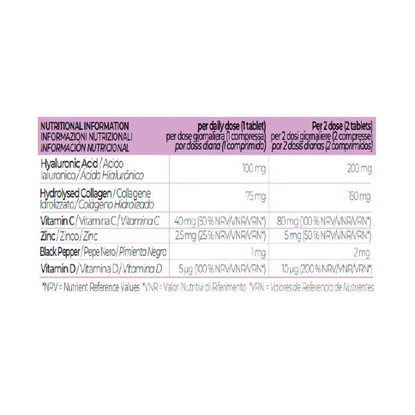El comprimido contiene la dosis óptima de ácido hialurónico junto con colágeno hidrolizado, extracto de pimienta negra, vitaminas y minerales que han sido cuidadosamente seleccionados por su capacidad para mejorar la hidratación y aportar juventud a la piel.