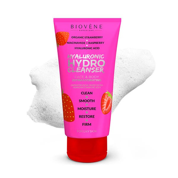 Limpiador extra hidratante para rostro y cuerpo con Ácido Hialurónico y Fresa Orgánica limpia suavemente la piel y elimina eficazmente las impurezas, el aceite y la suciedad para restaurar la firmeza.