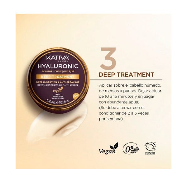 Para lograr mejores resultados, recomendamos usar toda la línea de productos Kativa Acido Hialurónico, Keratina y Coenzima Q10.