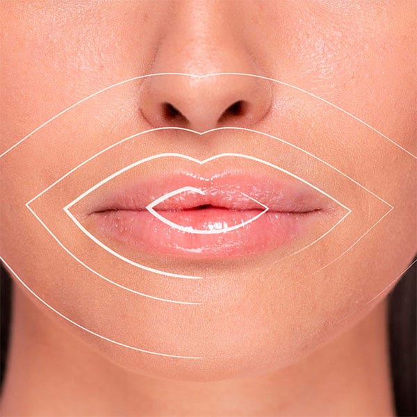- Comienza en el centro del labio y continúa extendiendo el Hyaluronic Lip Volumiser hacia ambos lados, llegando hasta las comisuras.