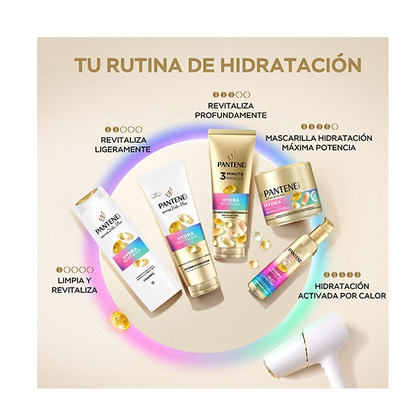 RUTINA DE RECARGA: Utilízalo después del champú Hydra Revitaliza para una nutrición que no apelmaza y termina con el protector térmico Heat & Glow para mejores resultados