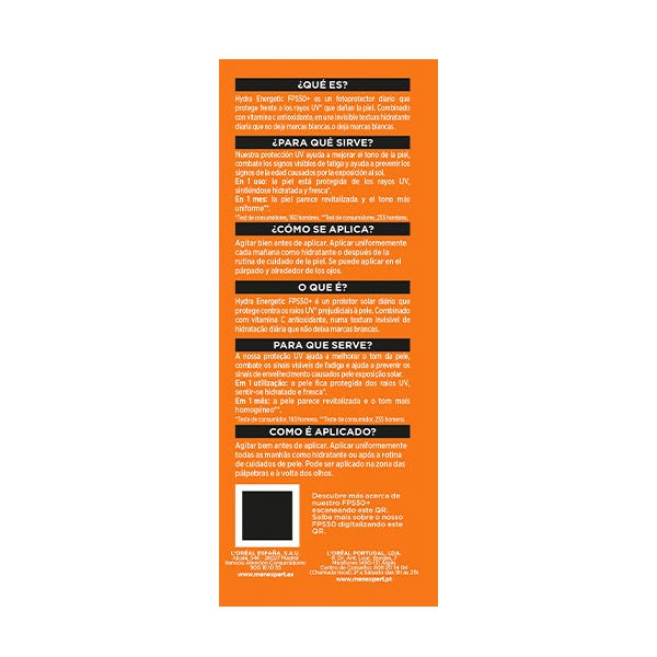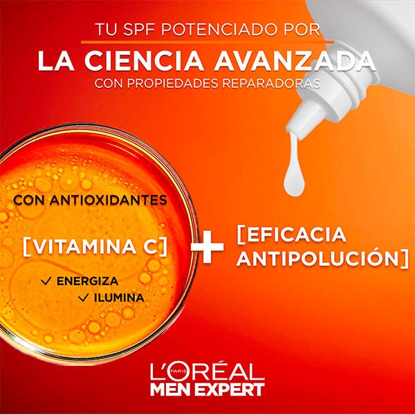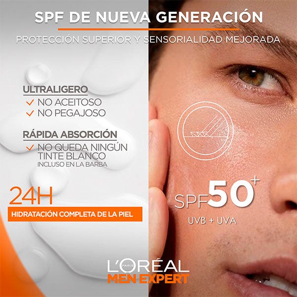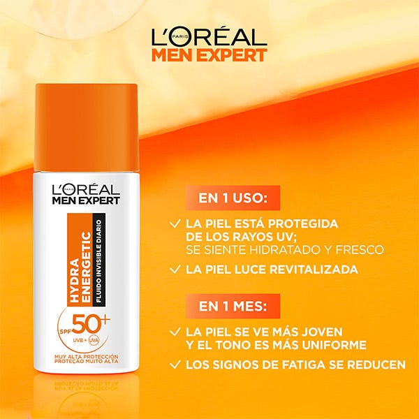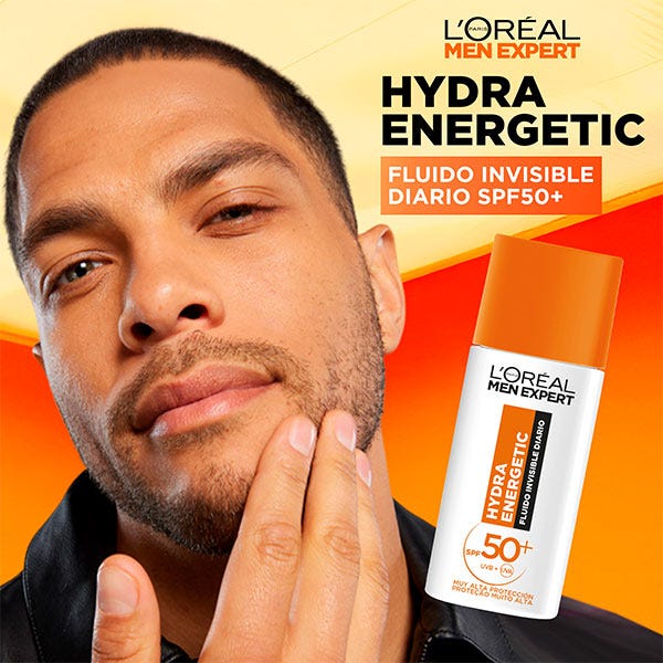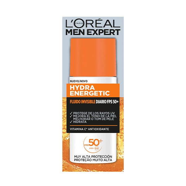 Descubre Hydra Energetic Fluido Invisible Diario FPS 50+ de L'Oréal Paris Men Expert, un protector solar avanzado diseñado especialmente para hombres. Su fórmula combina la potente acción antioxidante de la vitamina C con la revolucionaria tecnología Netlock™, ofreciendo una protección UVB/UVA de alta resistencia.