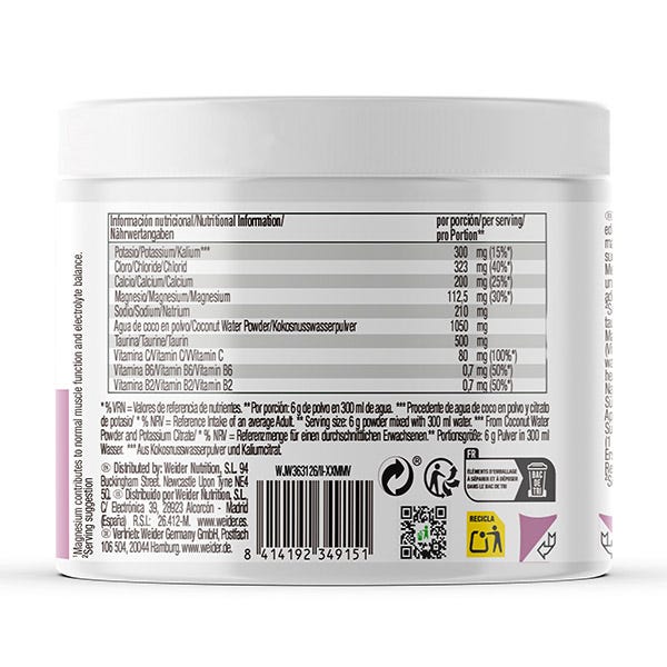 17% Agua de coco en polvo, Citrato de Calcio, Citrato de Potasio, acidulantes: ácido nítrico, ácido málico; Citrato de Magnesio, Cloruro de Sodio, Taurina, Aromas, Ácido ascórbico (vitamina C), remolacha en polvo (Beta vulgaris L.), Edulcorante: sucralosa; Clorhidrato de piridoxina (vitamina B6), riboflavina (vitamina B2).