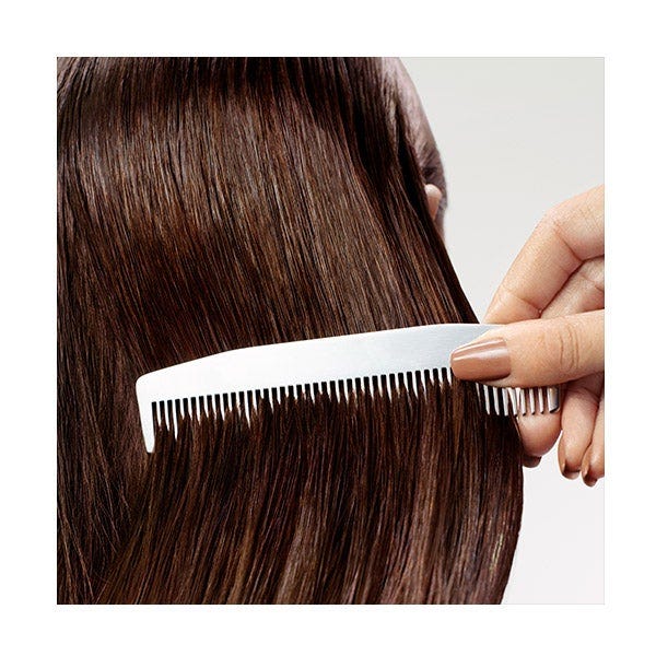 Eliminar el exceso de agua del cabello. Distribuir por el cabello húmedo, insistiendo en las puntas o las zonas que necesitan más hidratación. Aclarar con abundante agua.