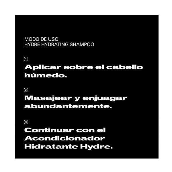 Masajear sobre cabello húmedo hasta hacer espuma. Aclarar y repetir si se desea. Para mejores resultados, aplicar después el acondicionador Hydre.