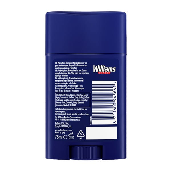 Además, gracias a su nueva fórmula anti-manchas no deberás preocuparte por manchar la ropa sea del color que sea. Y siempre con la fragancia original de Williams.