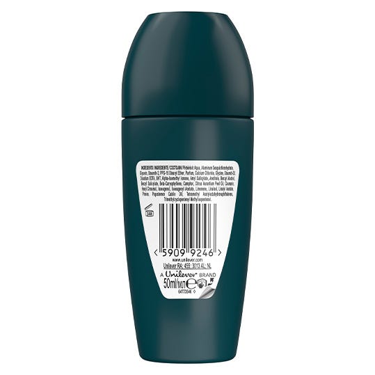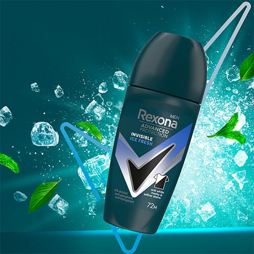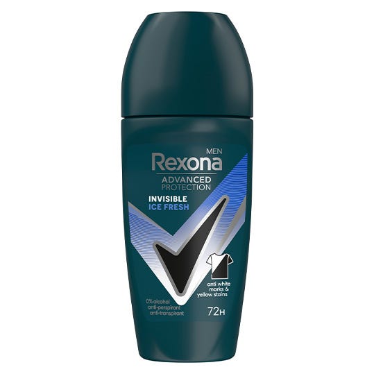 Desodorante antitranspirante en roll on para hombre Rexona Invisible Ice con tecnología antimanchas y fórmula 0% alcohol.