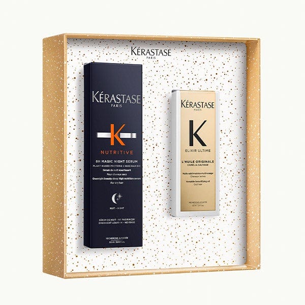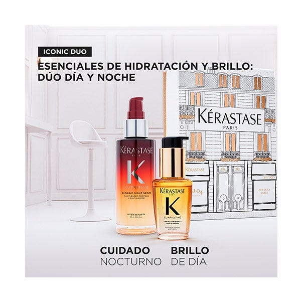 Kérastase Elixir & Nutritive Iconics Duo Holidays 2025 es un set festivo de edición limitada que incluye dos bestsellers absolutos de la gama Kérastase. Este dúo de regalo contiene el icónico aceite capilar Elixir Ultime L'Huile Originale y el nutritivo Nutritive Nectar Thermique Leave-in. Juntos forman una lujosa combinación que nutre intensamente, suaviza y proporciona protección a largo plazo contra el calor y el encrespamiento.
