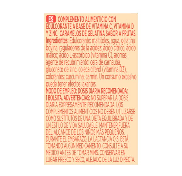 Complemento alimenticio con edulcorante a base de vitamina c, vitamina D y zinc. Caramelos de Gelatina sabor a frutas.