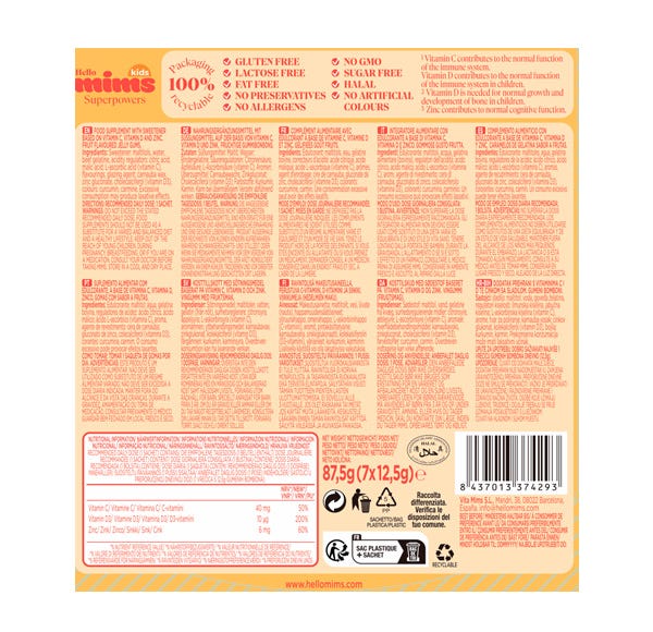 Gominolas sin azúcar y con vitaminas D, C y Zinc que ayudan a las defensas y al sistema inmunológico de los niños.