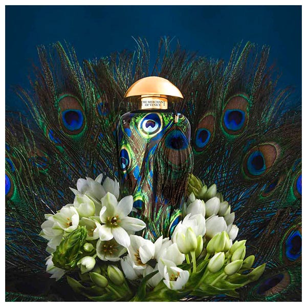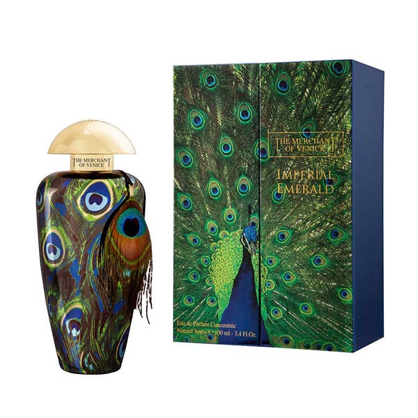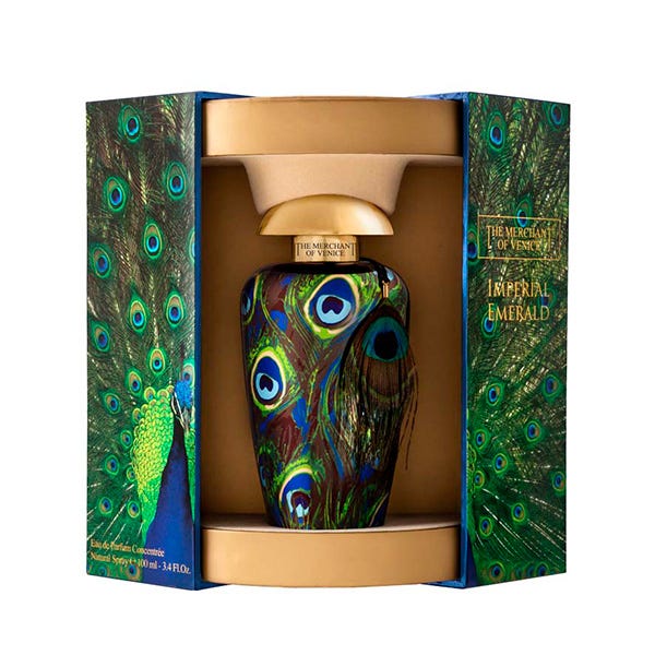 Imperial Emerald es la fragancia seductora de The Merchant of Venice que se inspira en el pavo real, la criatura más encantadora y majestuosa.