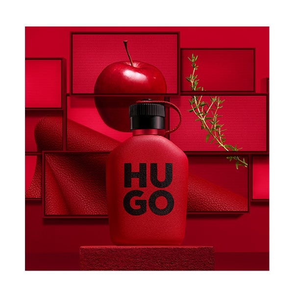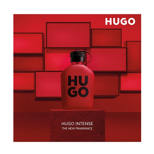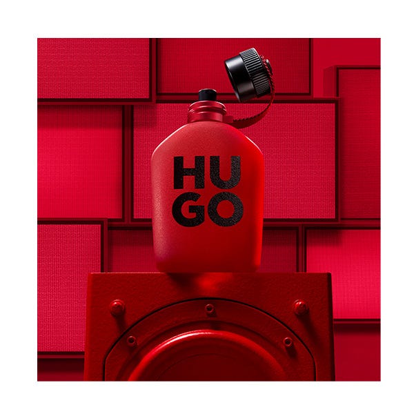 El frasco de HUGO INTENSE se presenta en rojo, con un acabado efecto hormigón y un atrevido logotipo negro, y se cierra con un llamativo tapón negro y una correa de tela roja para realzar aún más la intensidad.