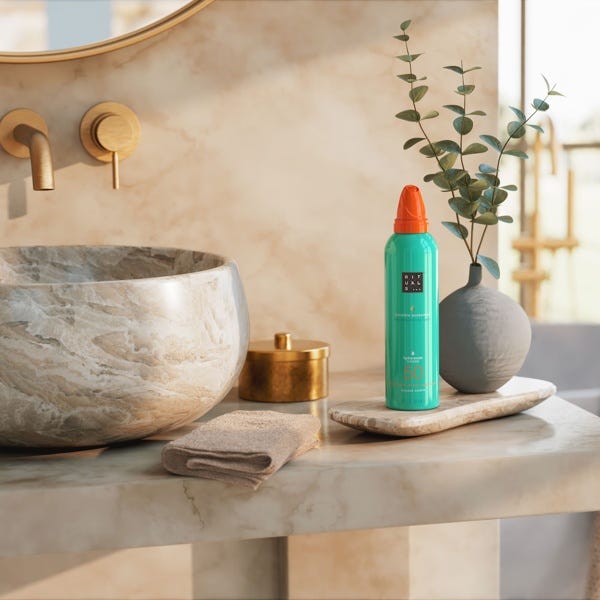 Mantén tu piel siempre protegida con el protector solar en espuma SPF 50 The Ritual of Karma, una fórmula ligera como el aire que ofrece una protección invisible y de amplio espectro contra los rayos UVA y UVB.
