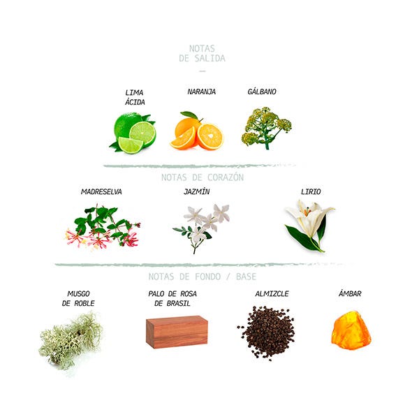 Aroma con notas de lima, naranja, jazmín, lirio, almizcle y ámbar.