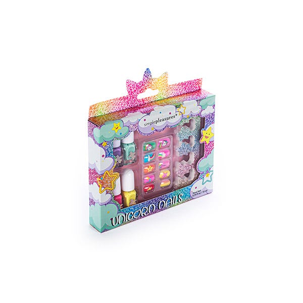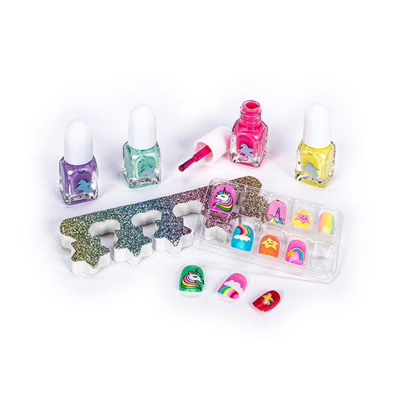 Contiene cuatro esmaltes de tonos vivos, uñas postiza con diseños mágicos y separador de uñas.