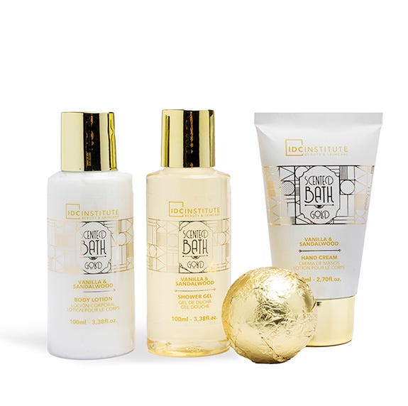 Esta hermosa bañera reutilizable es el regalo perfecto de nuestra colección Scented Bath Gold contiene un gel de baño, loción corporal, crema de manos y una bomba de baño, todos perfumados con una deliciosa fragancia de Vainilla y Sandalo.