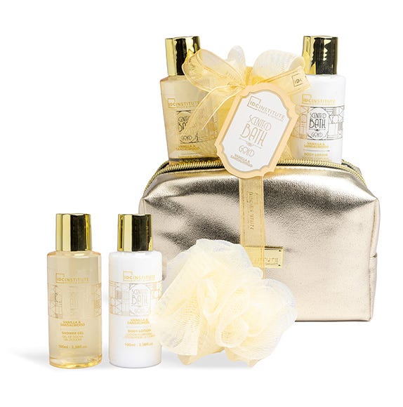 El set de baño mini de Scented Bath Gold es perfecto para llevar tus productos imprescindibles a donde quiera que vayas. Encuentra un gel de ducha, una loción corporal, una esponja de malla en un bonito y práctico neceser.
