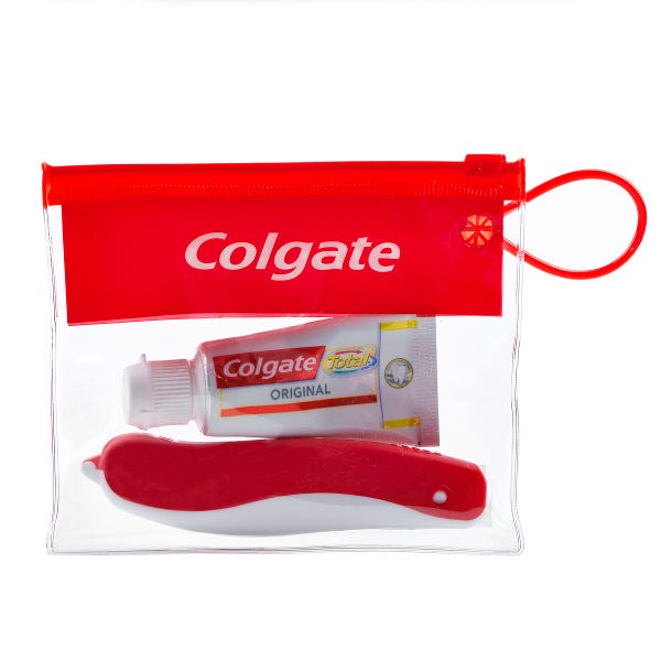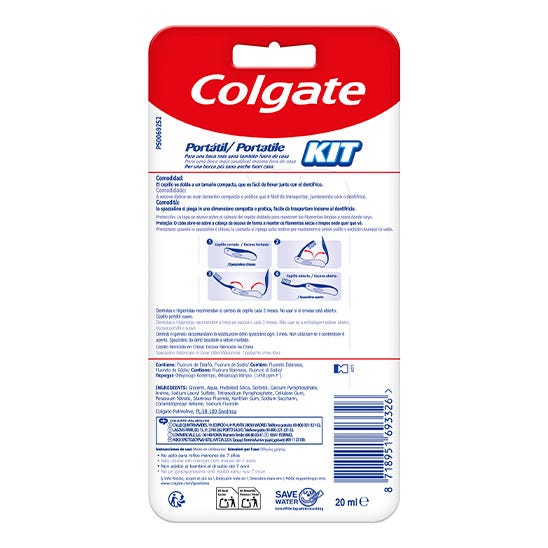 Colgate Kit Portátil incluye un cepillo dental suave de viaje y una pasta de 20ml, para una boca más sana también fuera de casa. El cepillo se dobla junto con el dentífrico en un práctico estuche. La tapa se mueve sobre el cabezal del cepillo doblado para mantener las cerdas limpias y secas.