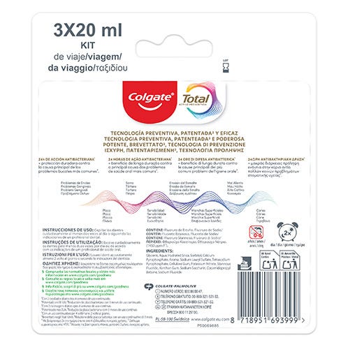 Obtén una protección completa para tus dientes y toda tu boca al cepillarte con la pasta de dientes Colgate Total Original. Con su fórmula que contiene duo zinc y arginina, este dentífrico con flúor proporciona 24 horas de protección antibacteriana*. Además, este dentífrico antibacteriano protege contra la caries, elimina la placa, revitaliza las encías y fortalece y repara el esmalte**. También reduce el sarro, protege los dientes sensibles y los blanquea para una sonrisa que deslumbra. Y al refrescar tu aliento, el dentífrico Colgate Total Original te proporciona la confianza para enfrentar el día a día sabiendo que tienes un aliento fresco y una boca protegida.