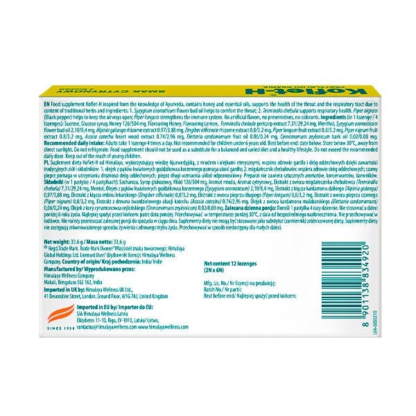 Koflet-H limón HIMALAYA es beneficioso para combatir la tos seca y productiva. Reduce la irritación de la mucosa bronquial. Las propiedades antiinflamatorias de Koflet-H reduce la inflamación del tracto respiratorio superior.