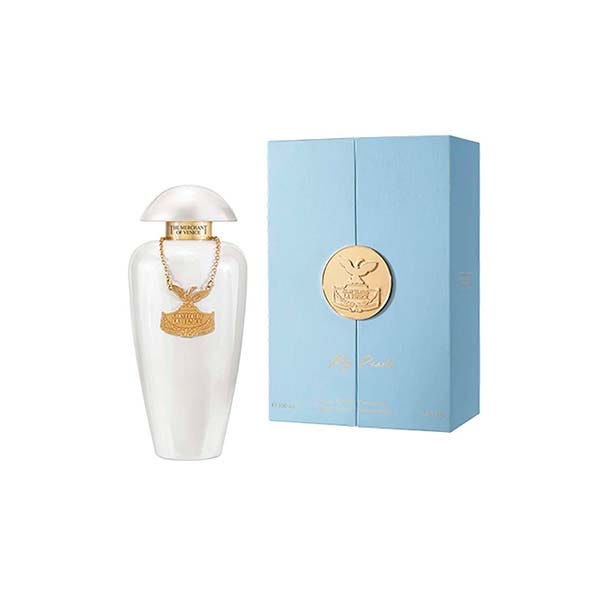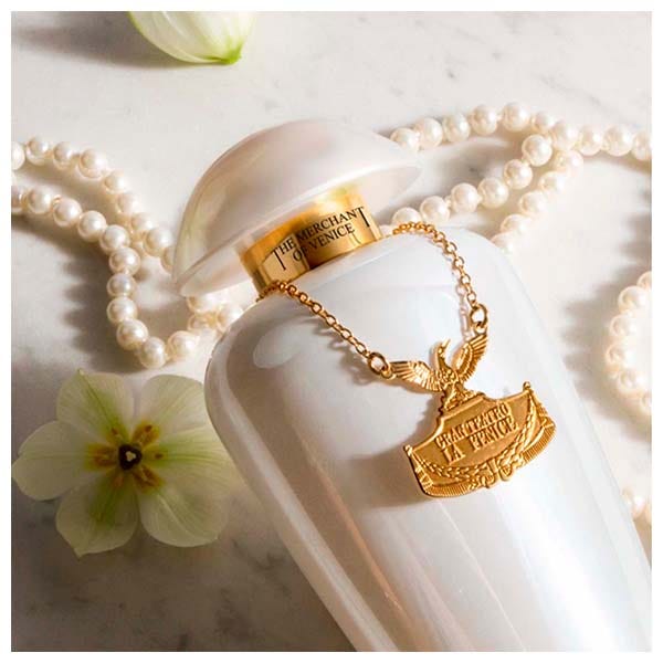 Un elegante frasco opalescente que contiene una fragancia floral, empolvada y almizclada, caracterizada por delicadas y suaves motas de flores blancas para rendir homenaje al Teatro veneciano y a sus prestigiosas intérpretes femeninas.