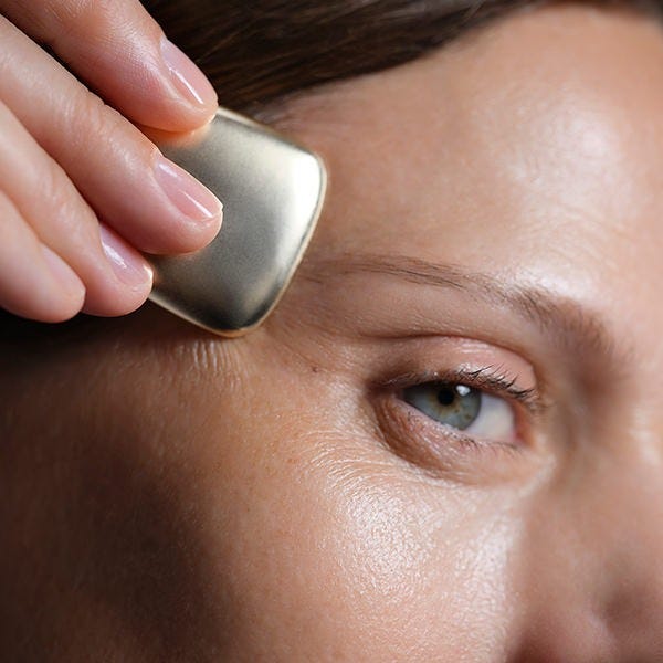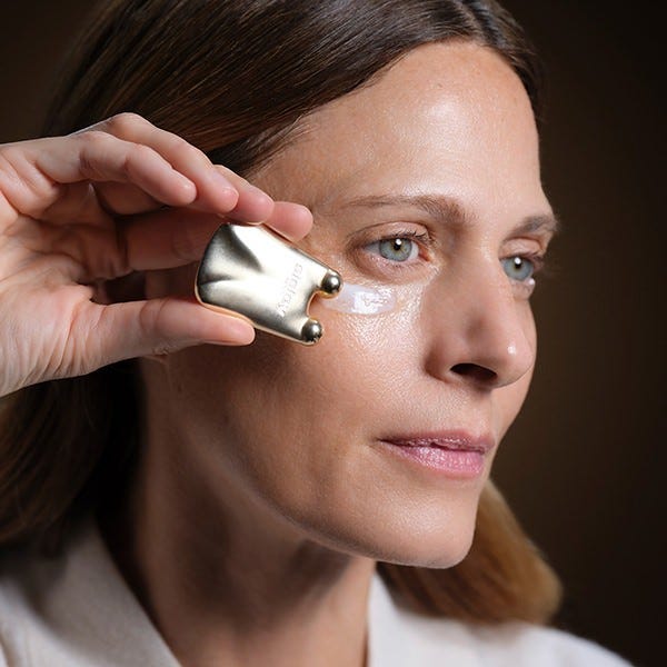 Para optimizar los resultados, este tratamiento incluye un accesorio de masaje exclusivo de zamac. Un gesto de aplicación en cuatro pasos a medida para revitalizar, alisar, tensar y estimular el contorno de los ojos.