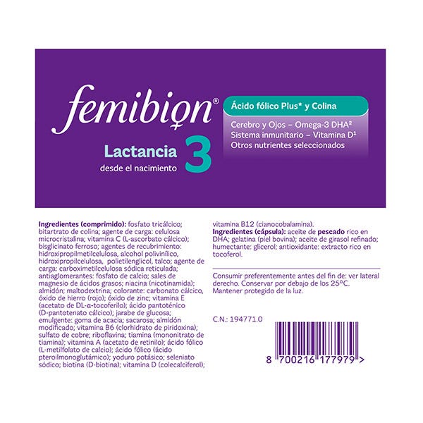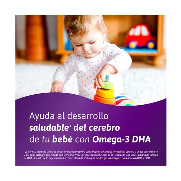Durante la lactancia, tu bebé comienza una etapa de gran crecimiento. Para contribuir al desarrollo normal del cerebro y los ojos de tu bebé, Femibion 3 el ácido graso omega-3 DHA, además de ácido fólico plus (ácido fólico y Metafolin®)³ y Colina ¹Vitamina D contribuye al normal funcionamiento del sistema inmunitario. ²