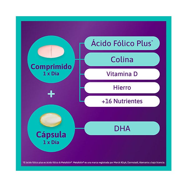 Comprimido: Fosfato Tricálcico; Bitartrato De Colina; Agente De Carga: Celulosa Microcristalina; Vitamina C (L-Ascorbato Cálcico); Bisglicinato Ferroso; Agentes De Recubrimiento: Hidroxipropilmetilcelulosa, Alcohol Polivinílico, Hidroxipropilcelulosa, Polietilenglicol, Talco; Agente De Carga: Carboximetilcelulosa Sódica Reticulada; Antiaglomerantes: Fosfato De Calcio; Sales De Magnesio De Ácidos Grasos; Niacina (Nicotinamida); Almidón; Maltodextrina; Colorante: Carbonato Cálcico, Óxido De Hierro (Rojo); Óxido De Zinc; Vitamina E (Acetato De DL-α-Tocoferilo); Ácido Pantoténico (D-Pantotenato Cálcico); Jarabe De Glucosa; Emulgente: Goma De Acacia; Sacarosa; Almidón Modificado; Vitamina B6 (Clorhidrato De Piridoxina); Sulfato De Cobre; Riboflavina; Tiamina (Mononitrato De Tiamina); Vitamina A (Acetato De Retinilo); Ácido Fólico (L-Metilfolato De Calcio (Metafolin)); Ácido Fólico (Ácido Pteroilmonoglutámico); Yoduro Potásico; Seleniato Sódico; Biotina (D-Biotina); Vitamina D (Colecalciferol); Vitamina B12 (Cianocobalamina). Cápsula: Aceite De Pescado Rico En DHA; Gelatina (Piel Bovina); Aceite De Girasol Refinado; Humectante: Glicerol; Antioxidante: Extracto Rico En Tocoferol
