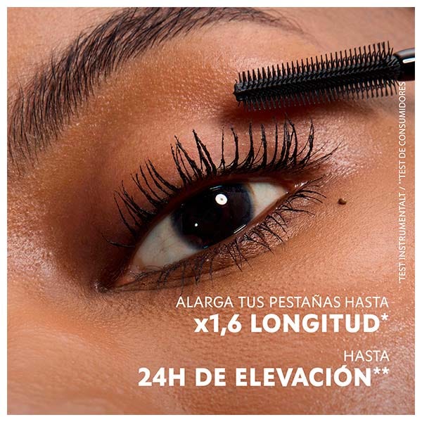 Aplica desde la base de las pestañas con movimientos en zigzag para alargar y levantar, luego aumenta el volumen con movimientos hacia arriba. Sostén en la base durante 3 segundos para fijar la elevación. Elimina con limpiador bifásico.