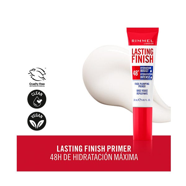 Lasting Finish Primer 48H Hydration Boost de Rimmel London, con biopeptidos para una intensa hidratación de hasta 48 horas. Rellena la piel y suaviza la apariencia de las líneas finas con el tiempo. Fórmula ligera y refrescante mejora visiblemente la opacidad al instante, proporcionando un acabado natural y brillante.
