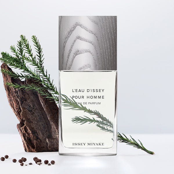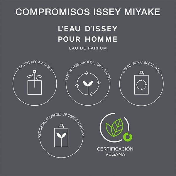 L'Eau d'Issey pour Homme Eau de parfum es una fragancia vegana, elaborada con un 92% de ingredientes de origen natural. La madera de cedro de origen 100% natural es reciclada. El bálsamo de abeto y la pimienta de Sichuan son 100% naturales y de origen responsable.