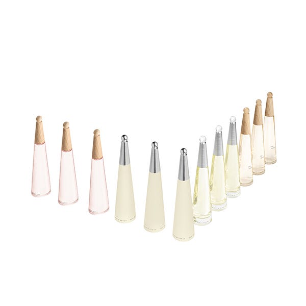 El frasco de L'Eau d'Issey Pivoine está fabricado con un 20% de vidrio reciclado y cuenta con un tapón que no contiene plástico y está fabricado con madera procedente de bosques gestionados de forma sostenible.
